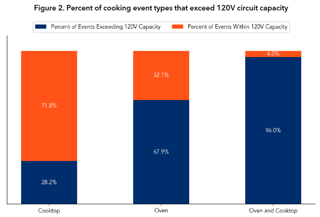 In 816 of the cooking events (13.2%), residents combined the use of the oven with at least one cooktop hob, which required the range’s power output to operate both end-uses simultaneously. This points to the real-world need for high peak power output – something a 120V battery-equipped product can provide even when the home’s electrical circuit cannot. The accompanying graph shows the percentage of cooking events that were within and exceeded the 120V capacity.