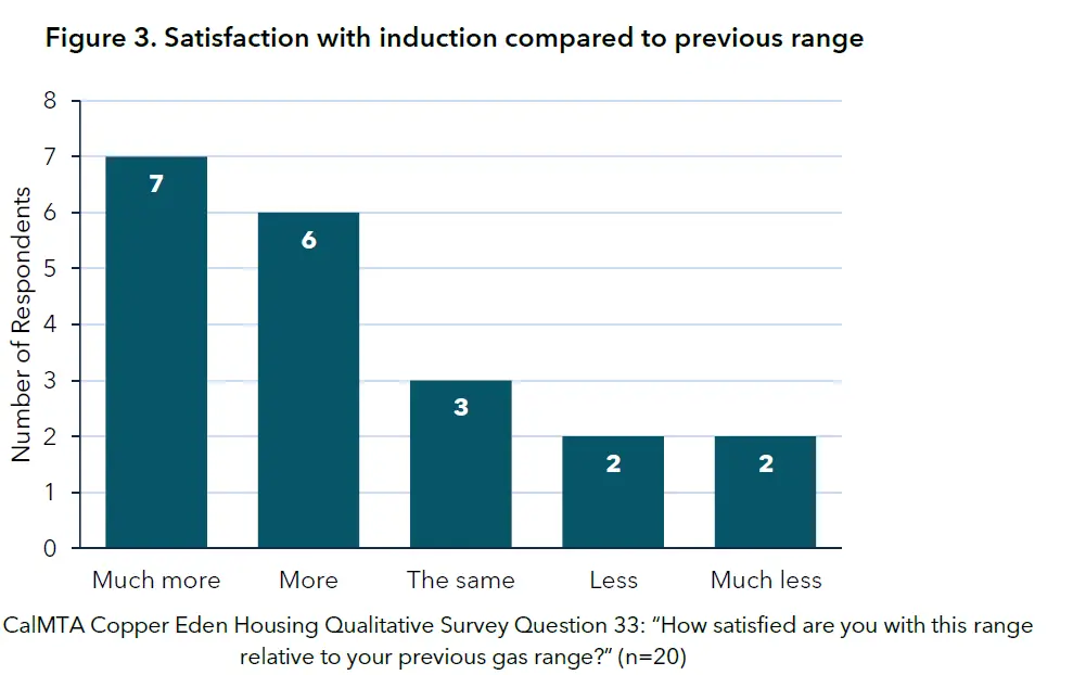 Of the 20 residents surveyed, 13 reported a higher level of satisfaction with the installed induction range than with their previous gas stove. Ease of cleaning, fast and precise cooking performance, and lower burn risk were identified as benefits appreciated by residents. Seventeen of the 20 residents said the induction range felt safer – the highest-ranked benefit overall and important insight for consumer messaging.