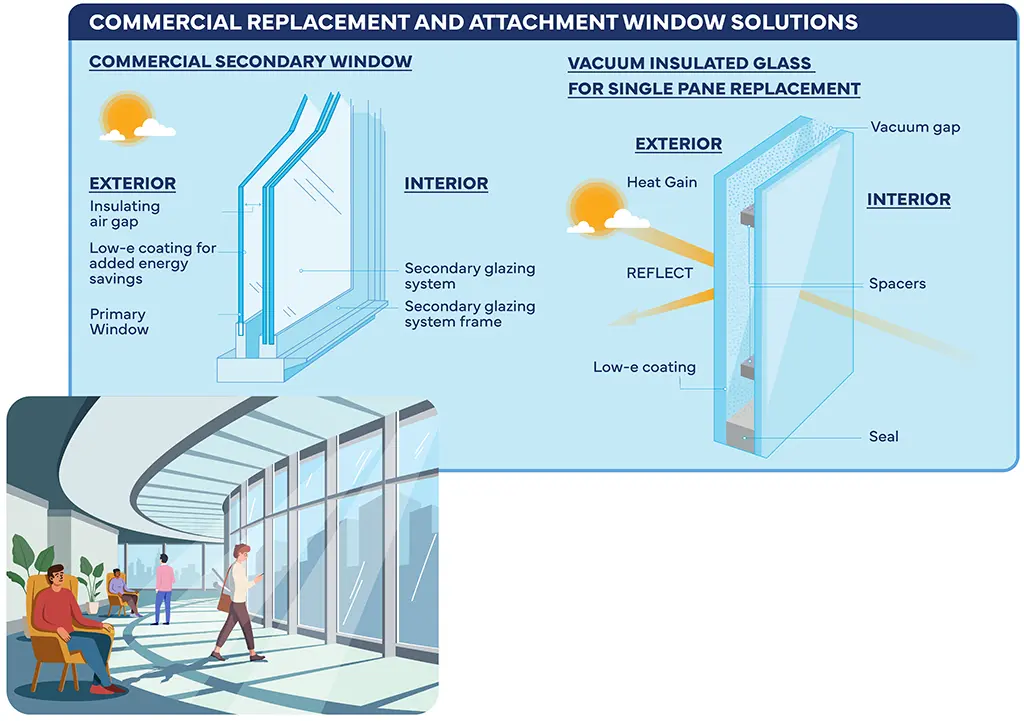 The Commercial Replacement and Attachment Window Solutions fact sheet describes the opportunity, technology, market transformation strategy and equity considerations for this initiative. Window upgrades in existing buildings offer a significant opportunity to improve building envelope thermal performance, reduce heating, ventilation, and air conditioning (HVAC) loads, and enable downsizing of HVAC