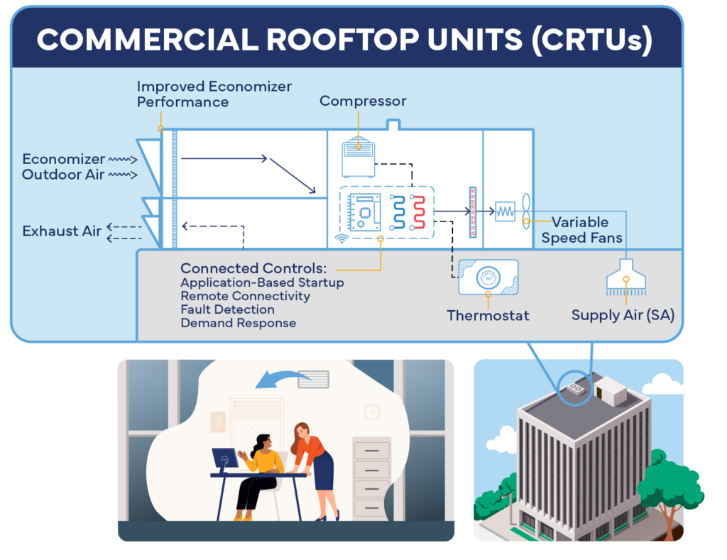 Nationwide, commercial rooftop units (CRTUs) make up approximately 37% of commercial buildings’ heating, ventilation, and air conditioning (HVAC) systems, and cover 50% of all commercial buildings’ floorspace.