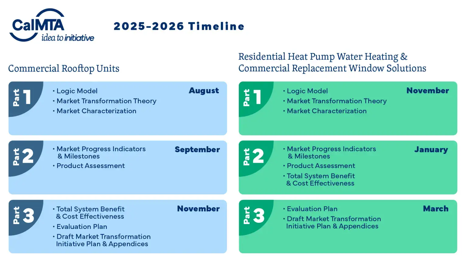 Over two years ago, CalMTA launched to form a portfolio of market transformation initiatives (MTIs) to increase energy efficiency and support California’s energy and climate goals. Plans for the first MTIs – Induction Cooking and Room Heat Pumps – were submitted via an Application to the California Public Utilities Commission (CPUC) in December 2024 and are now awaiting approval to begin implementation. These plans describe the business case for investment in the MTI including the strategic interventions, intended market outcomes, and evaluation activities that would be implemented during Phase III: Market Deployment.