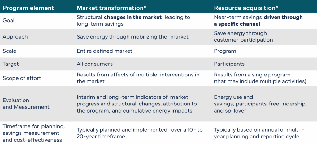 On the other hand, market transformation focuses on working with actors upstream in the supply chain, with market-level interventions that create benefits in the longer-term, and ultimately result in large and lasting savings. Both RA and MT deliver cost-effective benefits that reduce the amount of energy needed to meet end-user demand, but on a different timeline. Finally, market transformation programs phase out once they have achieved their market goals.