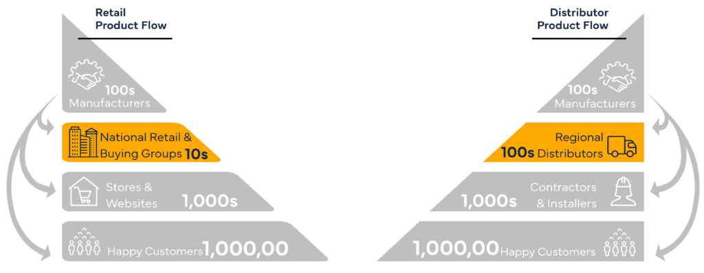 Interventions are typically focused on influencing supply chain entities that offer market leverage, such as manufacturers, distributors, contractors, retailers, and organizations representing industries and customer groups. This leverage can allow the intervention to have an outsized impact. The key focus for MT programs is to work with targeted market actors, and the rules that govern the products in the supply chain, to drive adoption of a technology or practice and ultimately cause it to become a normal part of how the market operates.