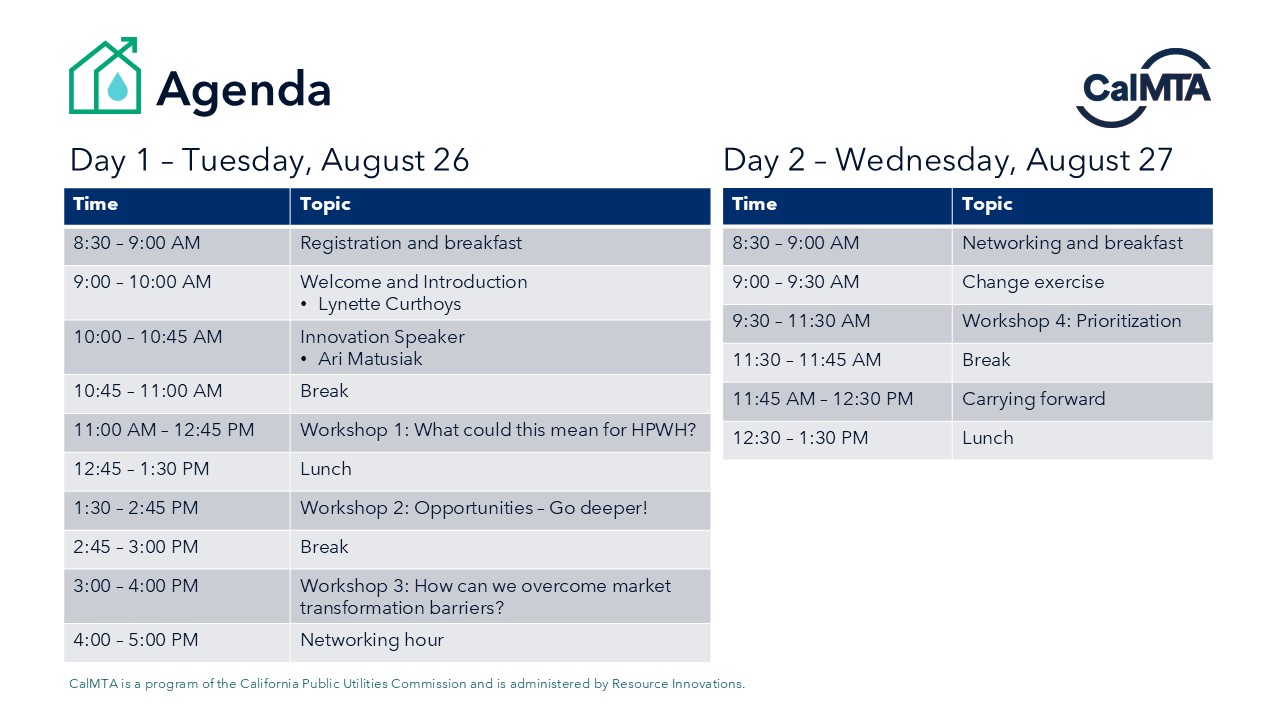CalMTA hosted a Residential Heat Pump Water Heating (HPWH) Market Acceleration Summit from Aug. 26-27 in Oakland, California. This invitation-only event brought 40 leaders, innovators, and decision-makers together to help define the pathways that will make heat pump water heaters (HPWHs) the preferred choice for California homes.