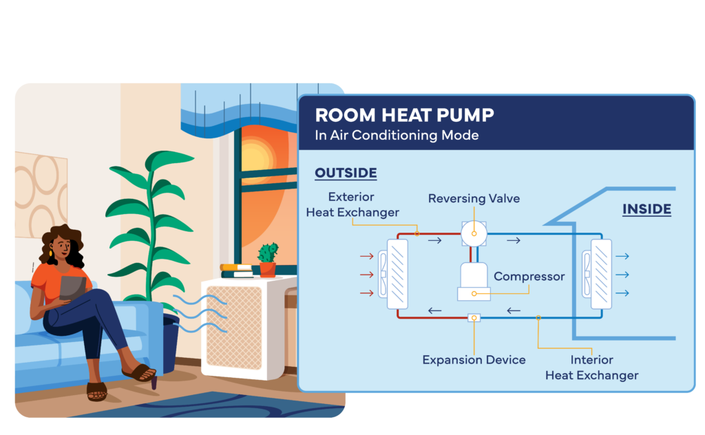 Room heat pumps are self-contained products that provide efficient heating and cooling for small spaces, such as single rooms, modest apartments, or small homes. They offer both heating and cooling using efficient heat pump technology and can be installed without a certified technician.