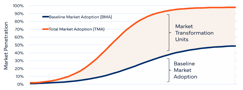 Figure 1 below shows the area between the Baseline Market Adoption and Total Market Adoption S-curves. The differential is the increase resulting from MT activities that deliver cost-effective energy efficiency, greenhouse gas (GHG) reductions, or other identified benefits.